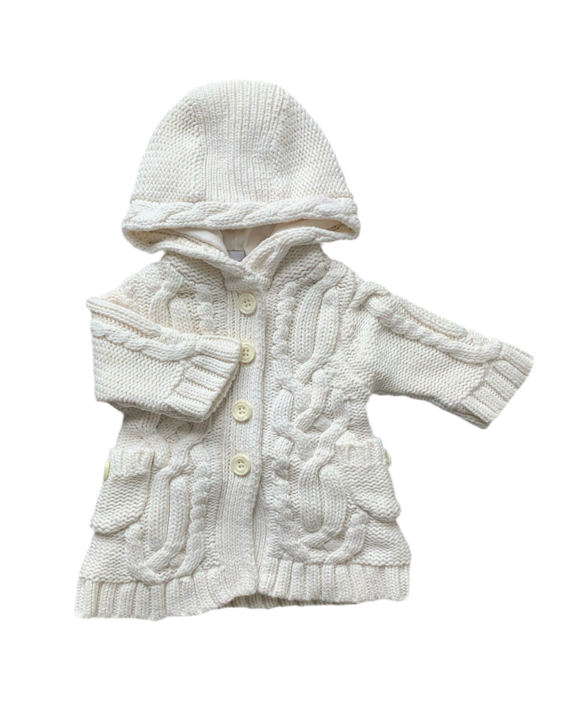 Cardigan à capuche en tricot. Poches avant. Boutons.