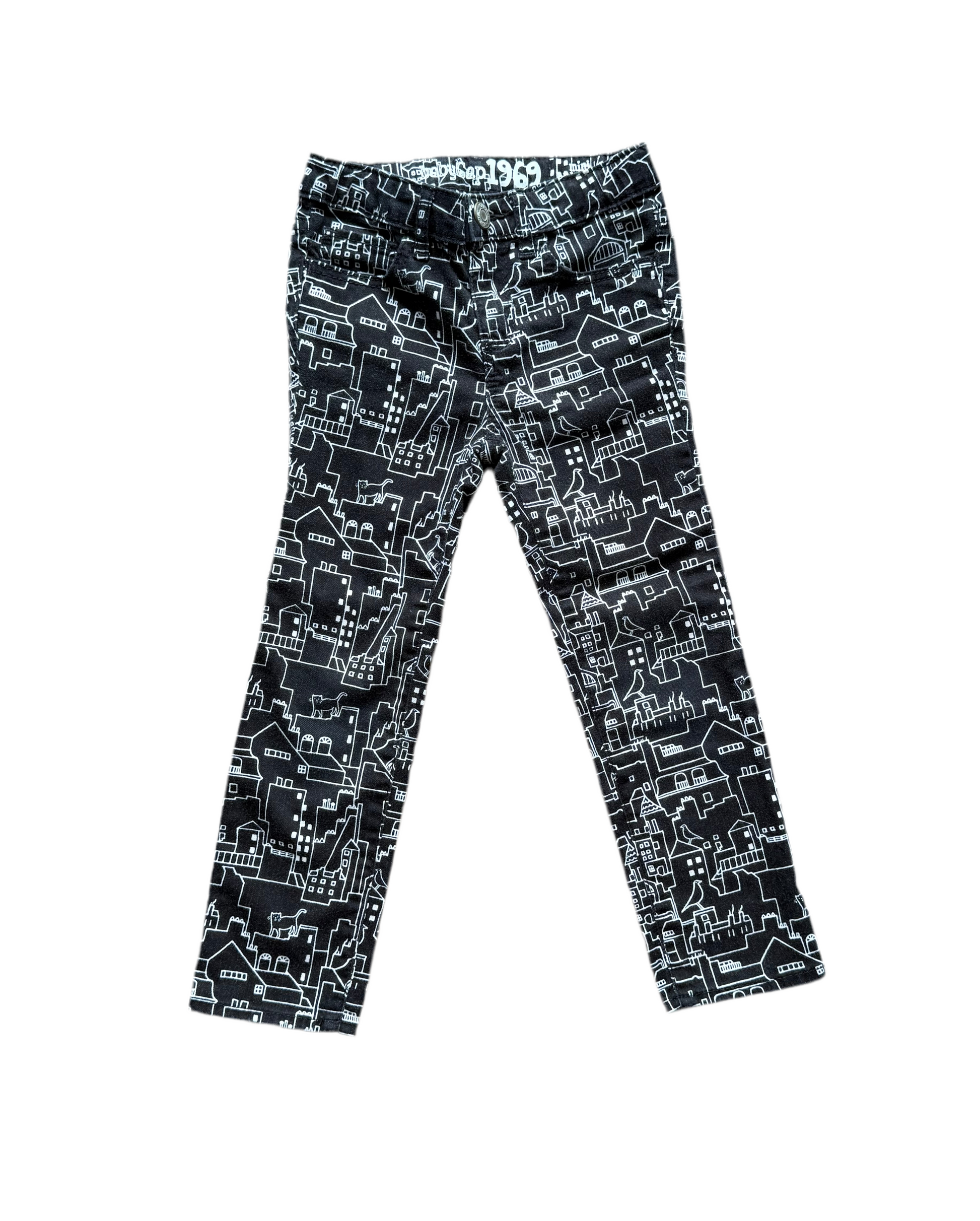 Pantalon style « denim ». Imprimé « Ville 🏙️ ». Poches avant et arrière. Bouton-pression