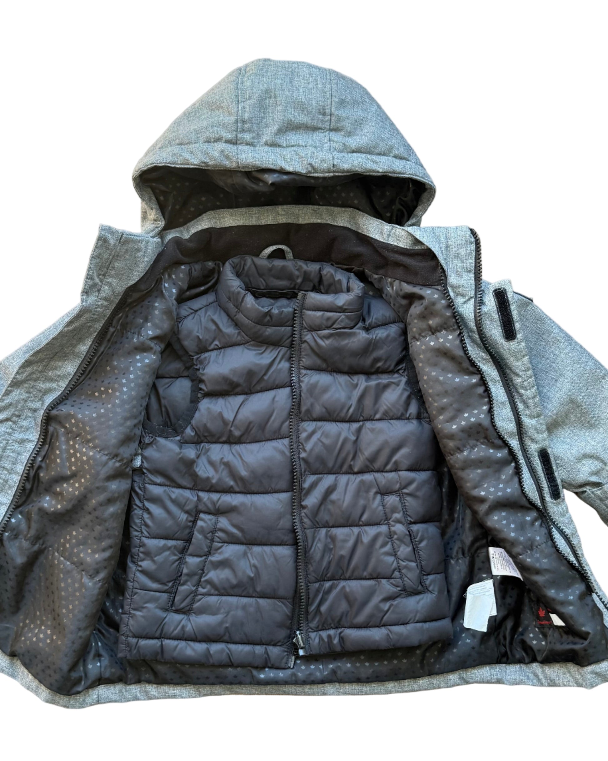 Manteau à capuche mi-saison automne-printemps. Ajustable au niveau des manches. Fermeture éclair. Poches. Veste style débardeur convertible et détachable pour les jours plus chauds.