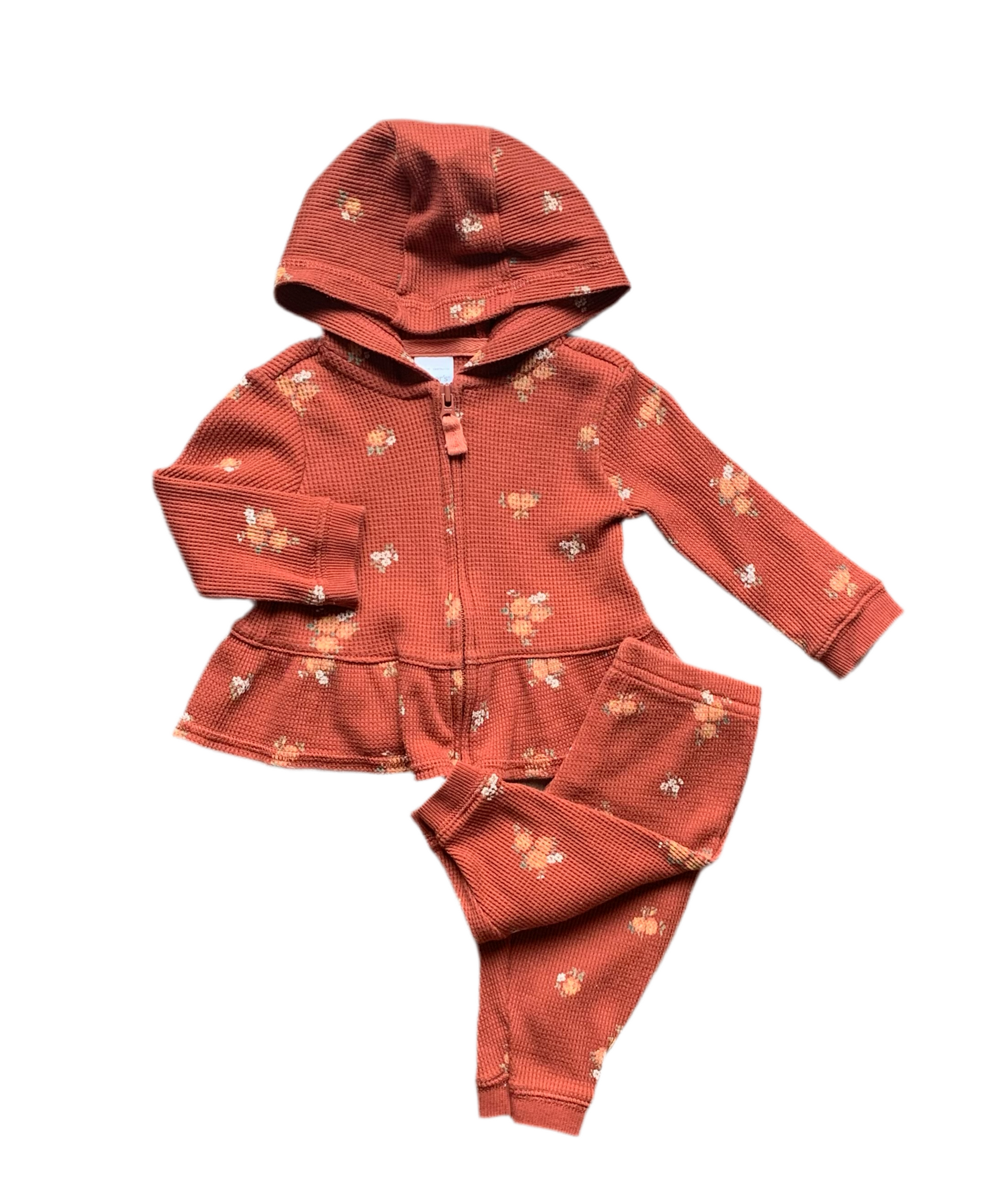 Ensemble fleuri deux pièces, legging et veste zippée avec un capuchon.