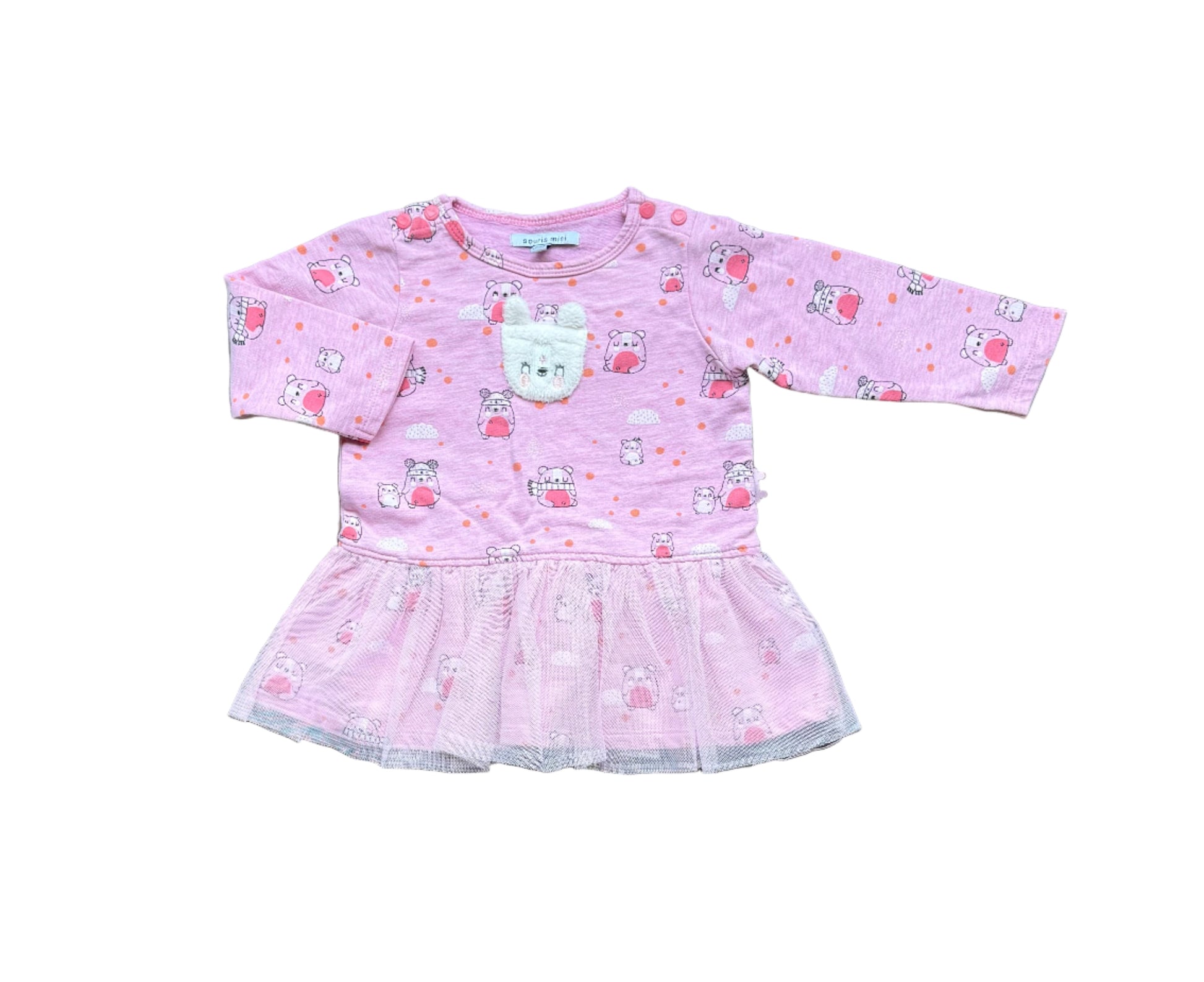 Robe bi-matière avec tulle. Imprimé « ourson ». Détail ourson en Sherpa. Boutons-pression au niveau du col.
