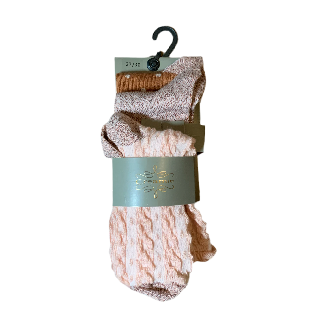 Magnifique ensemble de trois paires de bas. Rose avec détail cordes. Rose mélangée. Marron à pois.