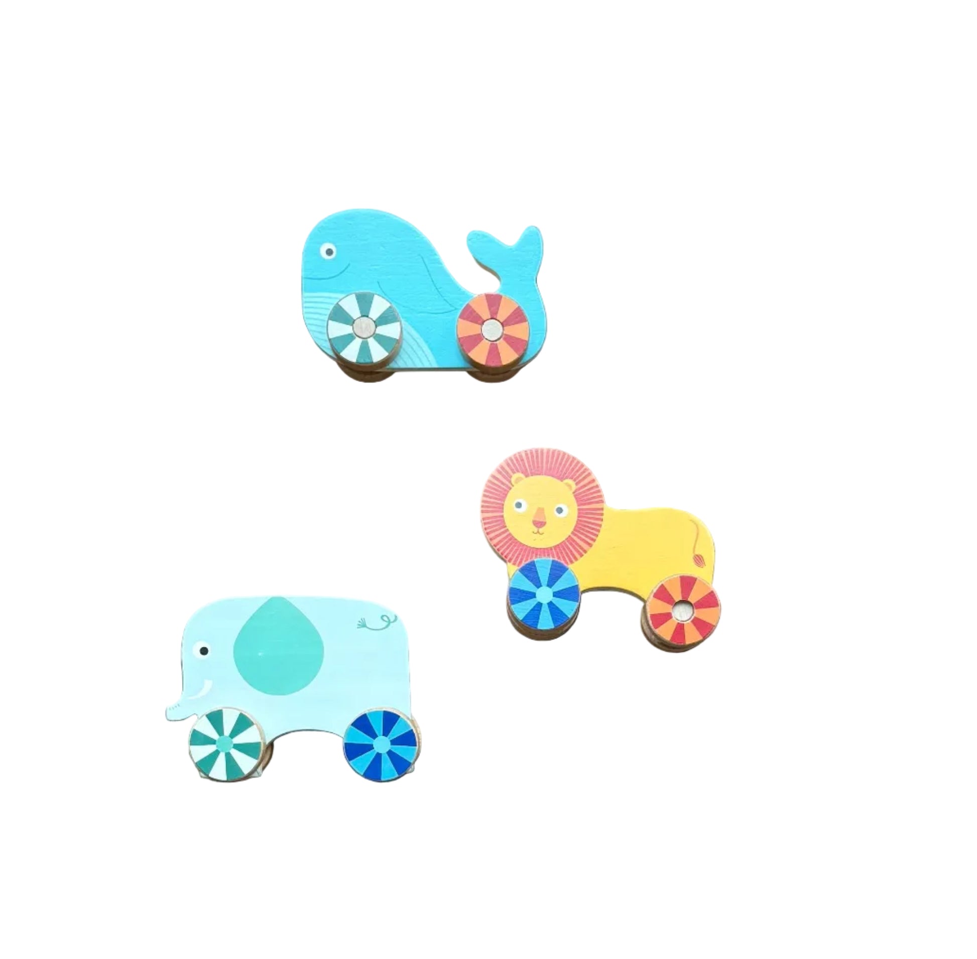 Ensemble de trois petite voiture en forme de « animaux ». Roulettes interchangeables.