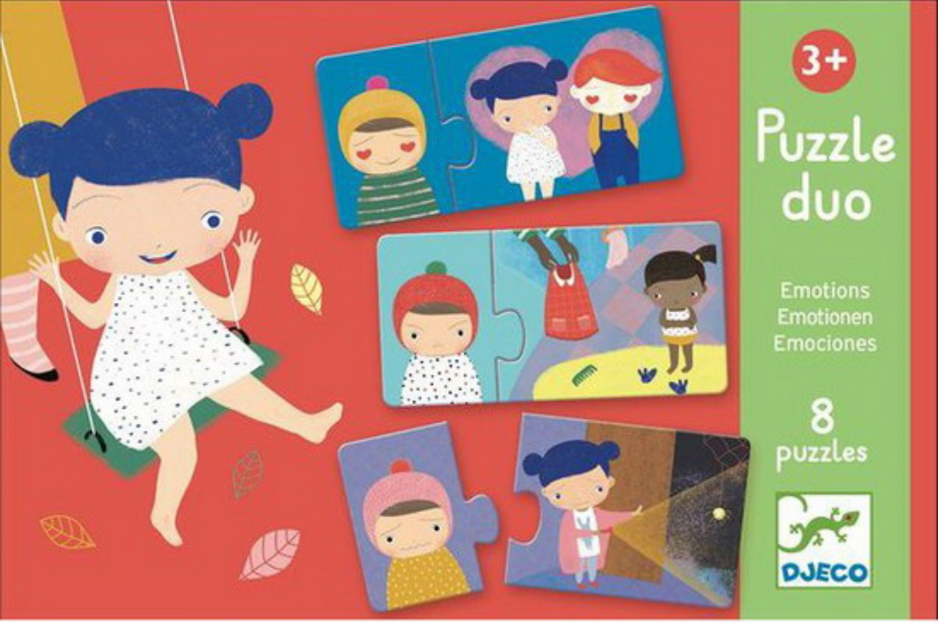 Découvrez les puzzles duo émotions, 8 puzzles éducatifs de Djeco à partir de 3 ans pour illustrer les émotions comme l'amour, la colère, la surprise...