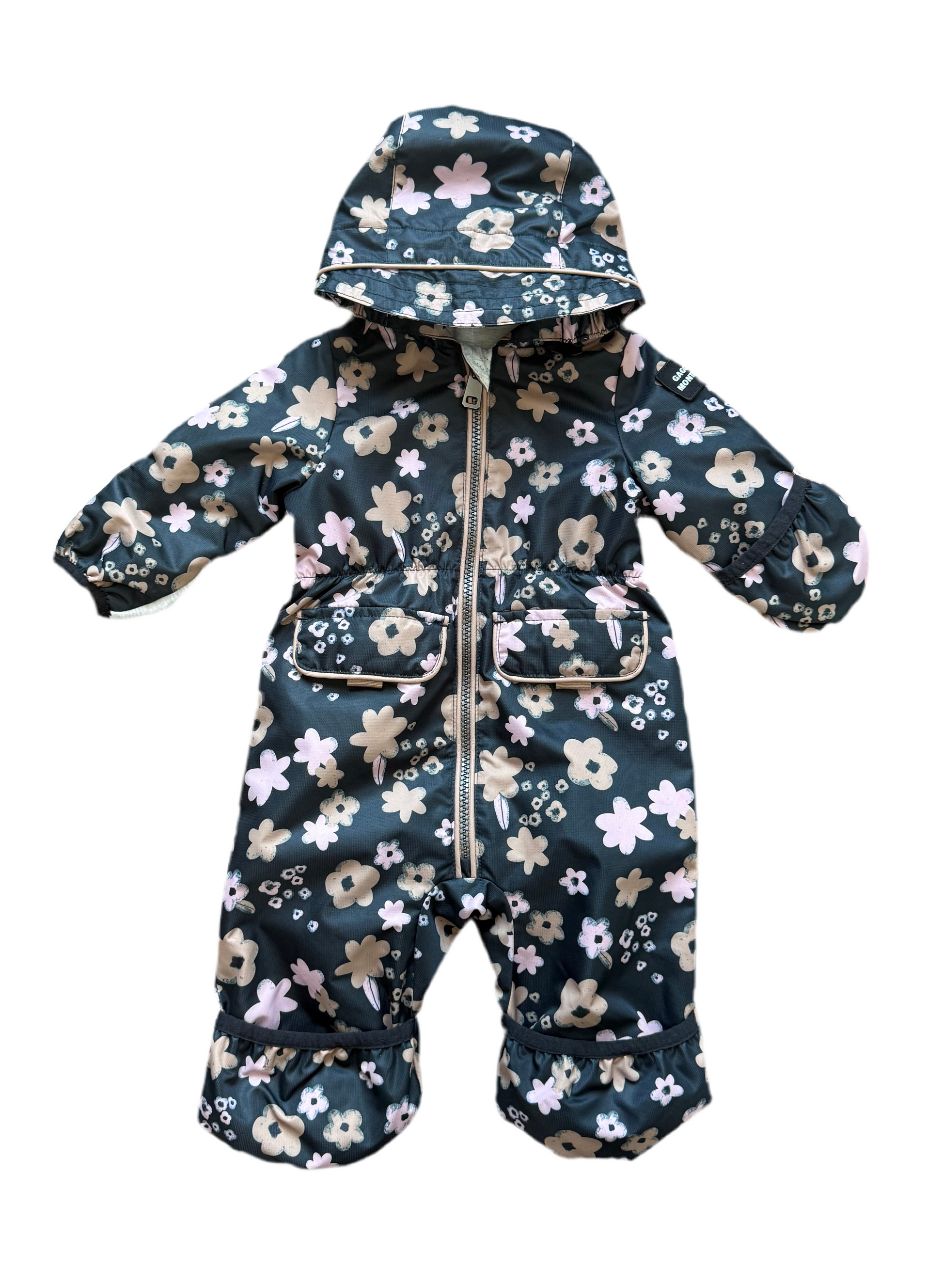 Magnifique combinaison une pièce à capuche idéal pour le printemps 🌸. Mitaines et pieds rabattantes. Poches avant. Fermeture éclair.
