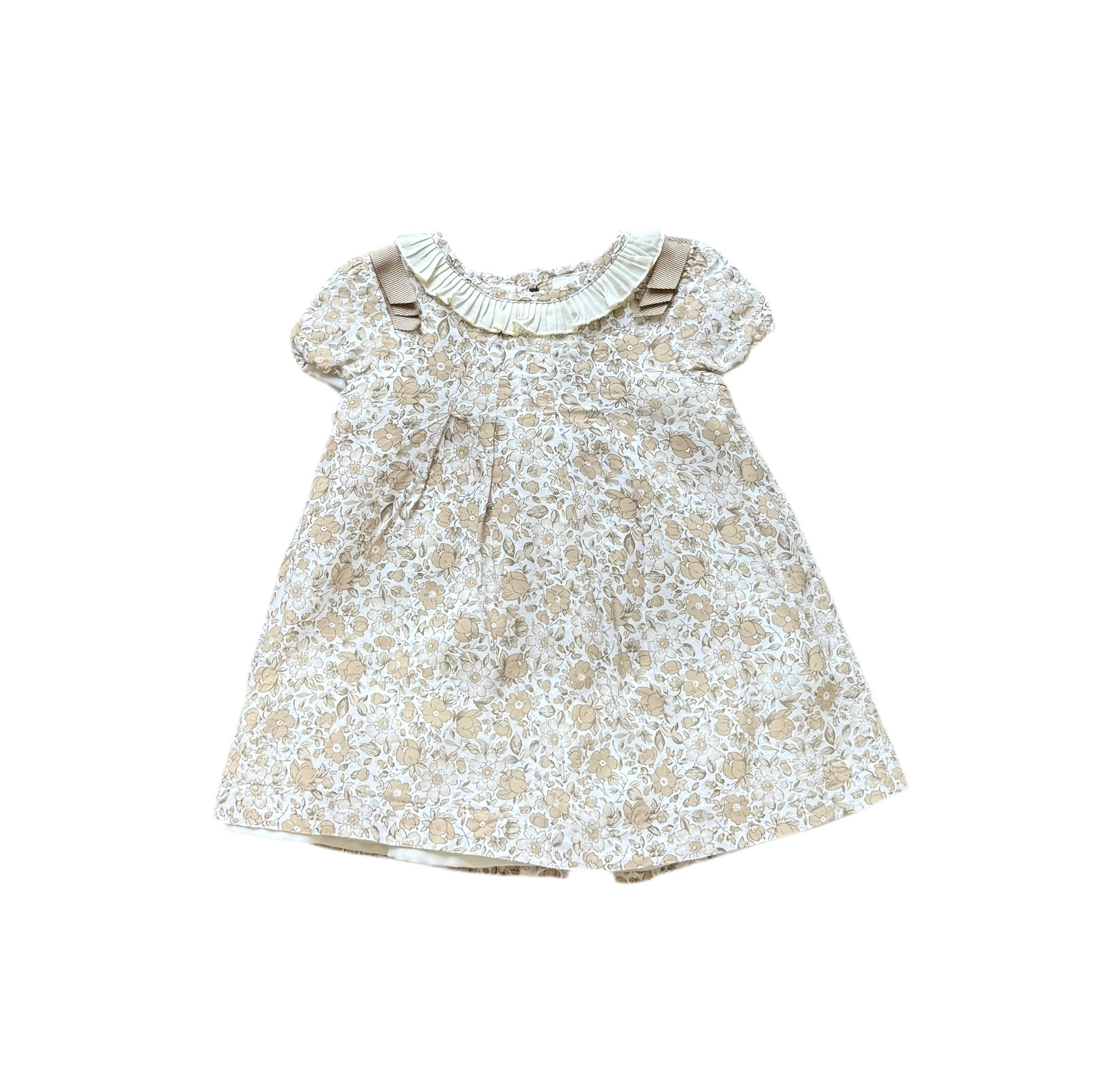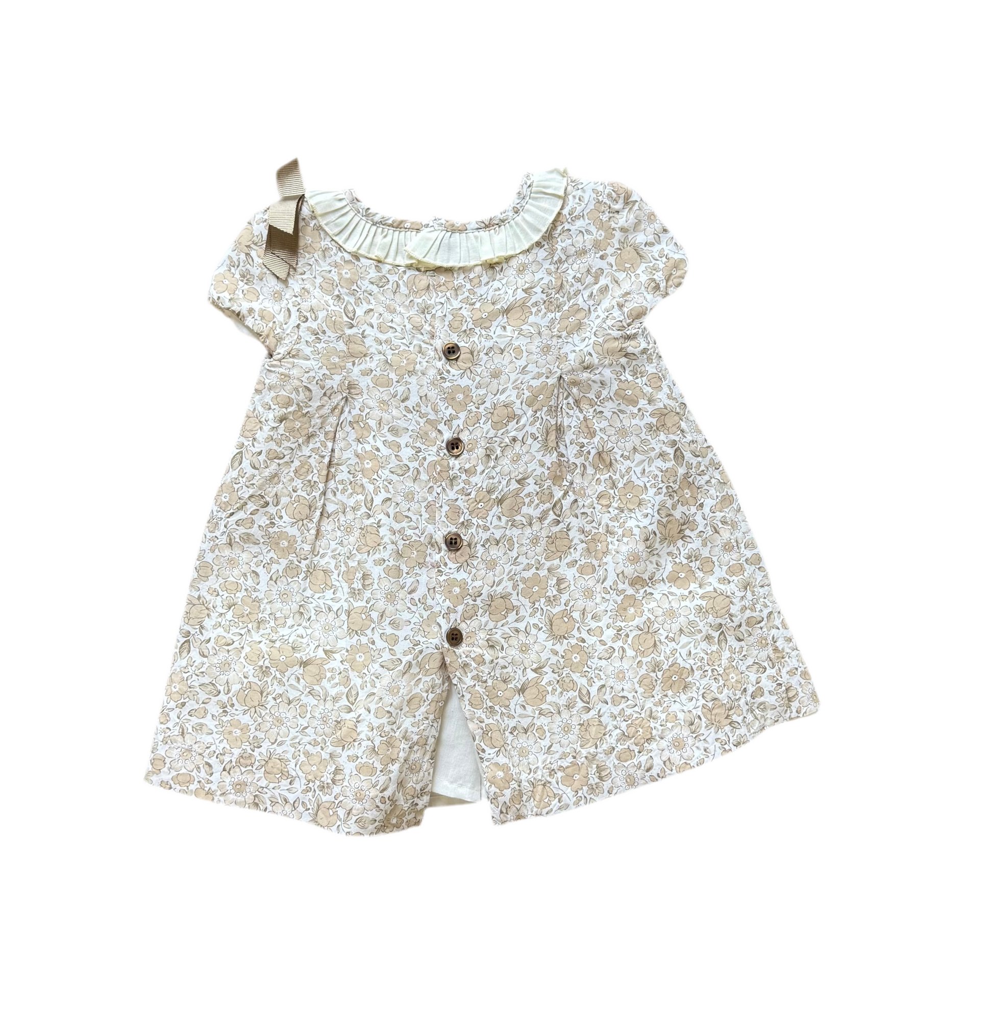 Robe imprimée « floral doré ». Boutons au niveau du dos. Rubans.