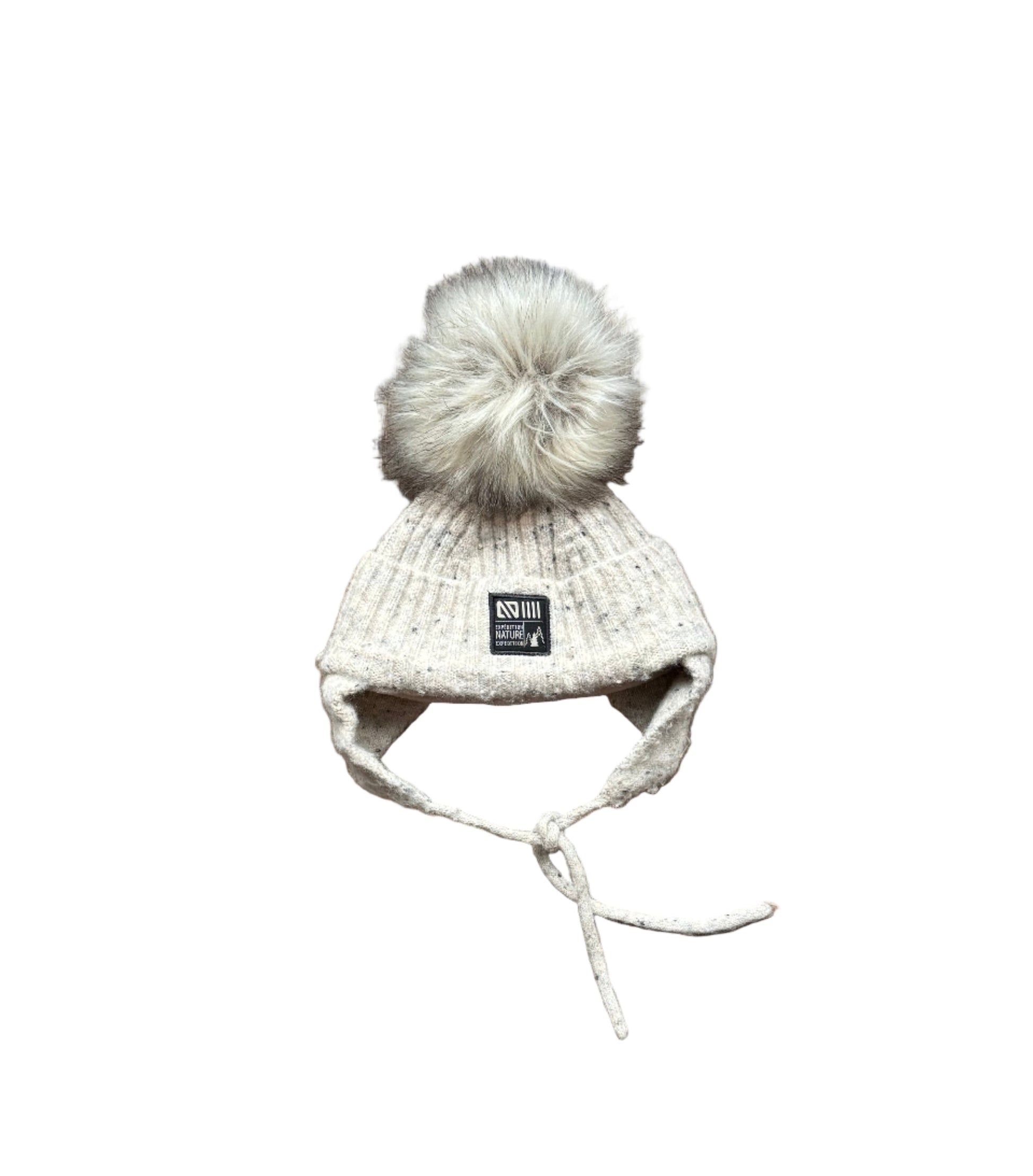 Tuque avec un pompon. Doublé en micro polar. Ajustement au niveau du cou.