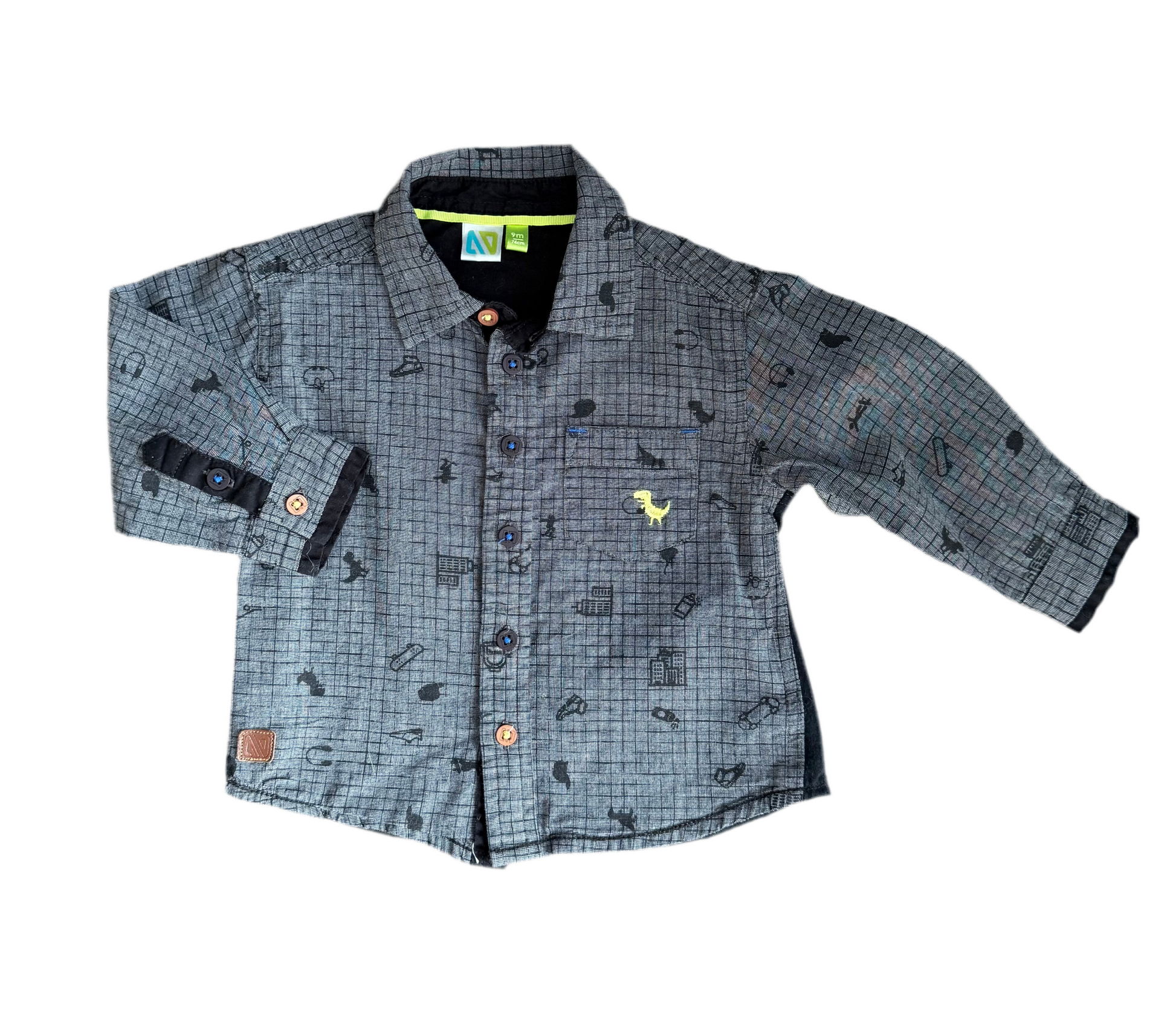 Chemise imprimée« école et dinosaure ». Boutons. Broderie dinosaure 🦖. Poche avant.