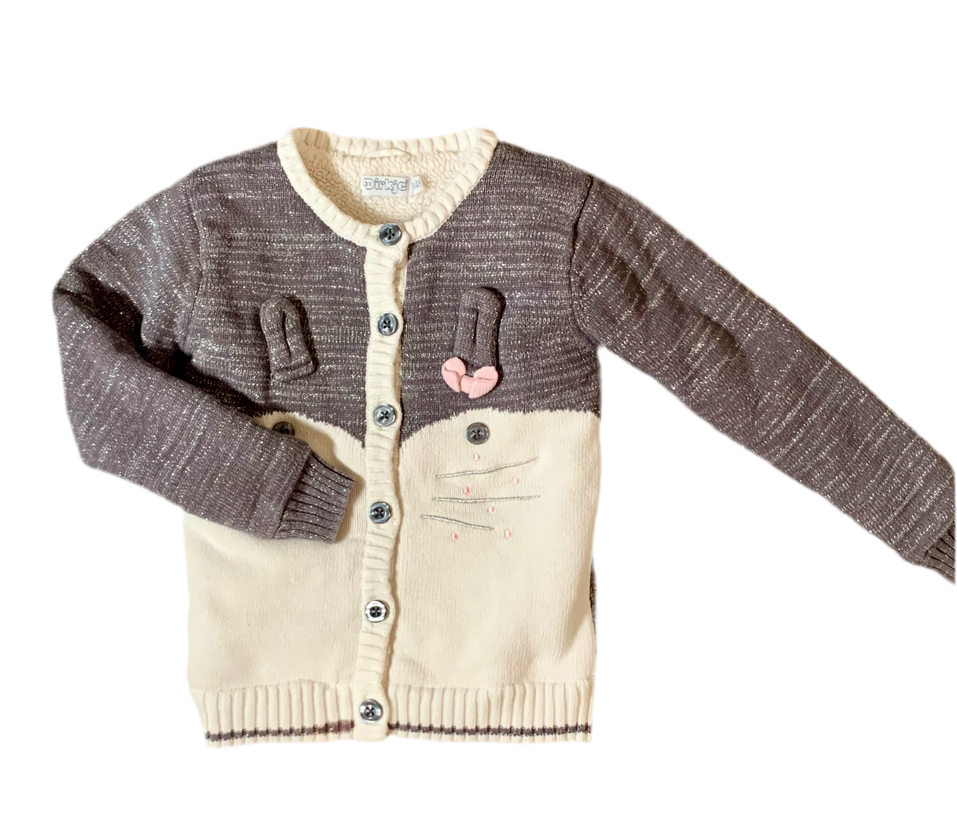 Magnifique cardigan doublé. Tissu scintillant, design lapine. Boutons.