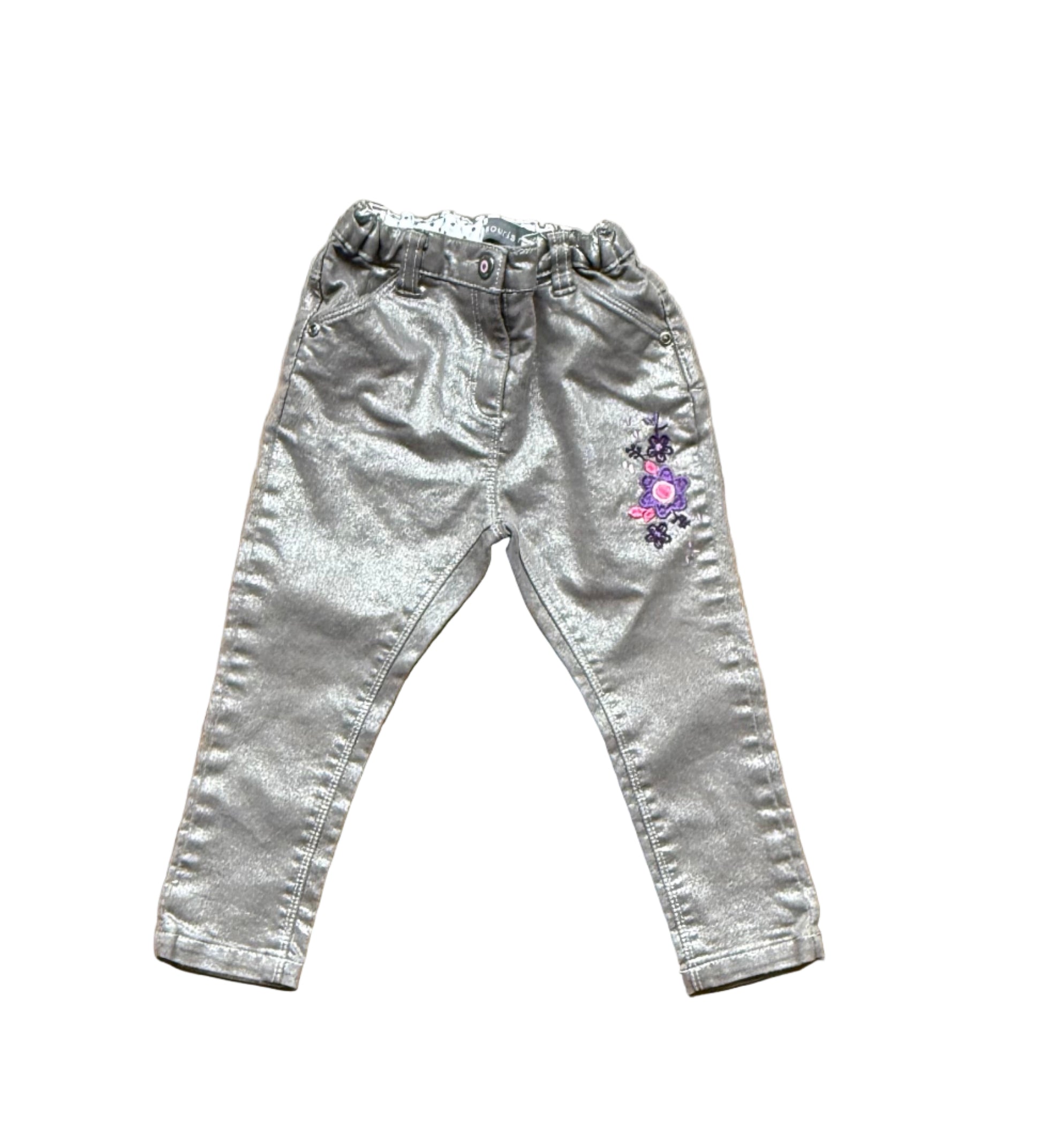 Pantalon style « jeans ». Tissu « scintillant ». Broderie de fleurs.