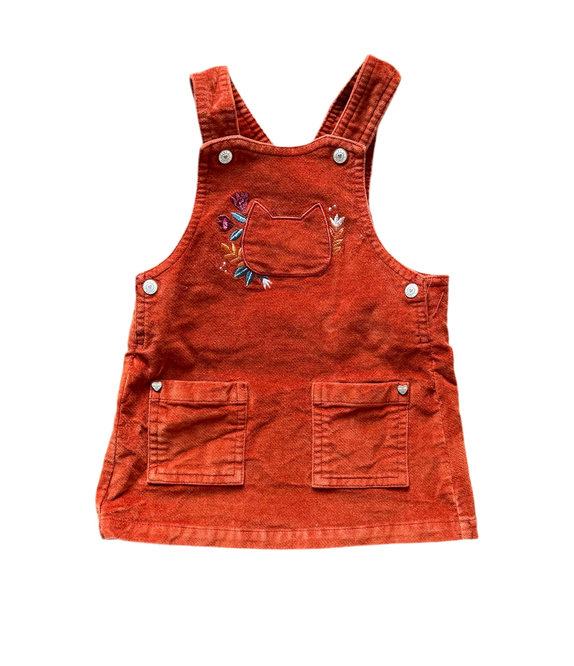 Robe-salopette en velours côtelé. Poches avant . Broderies. Imprimé « chat ». Ajustable au niveau des bretelles.