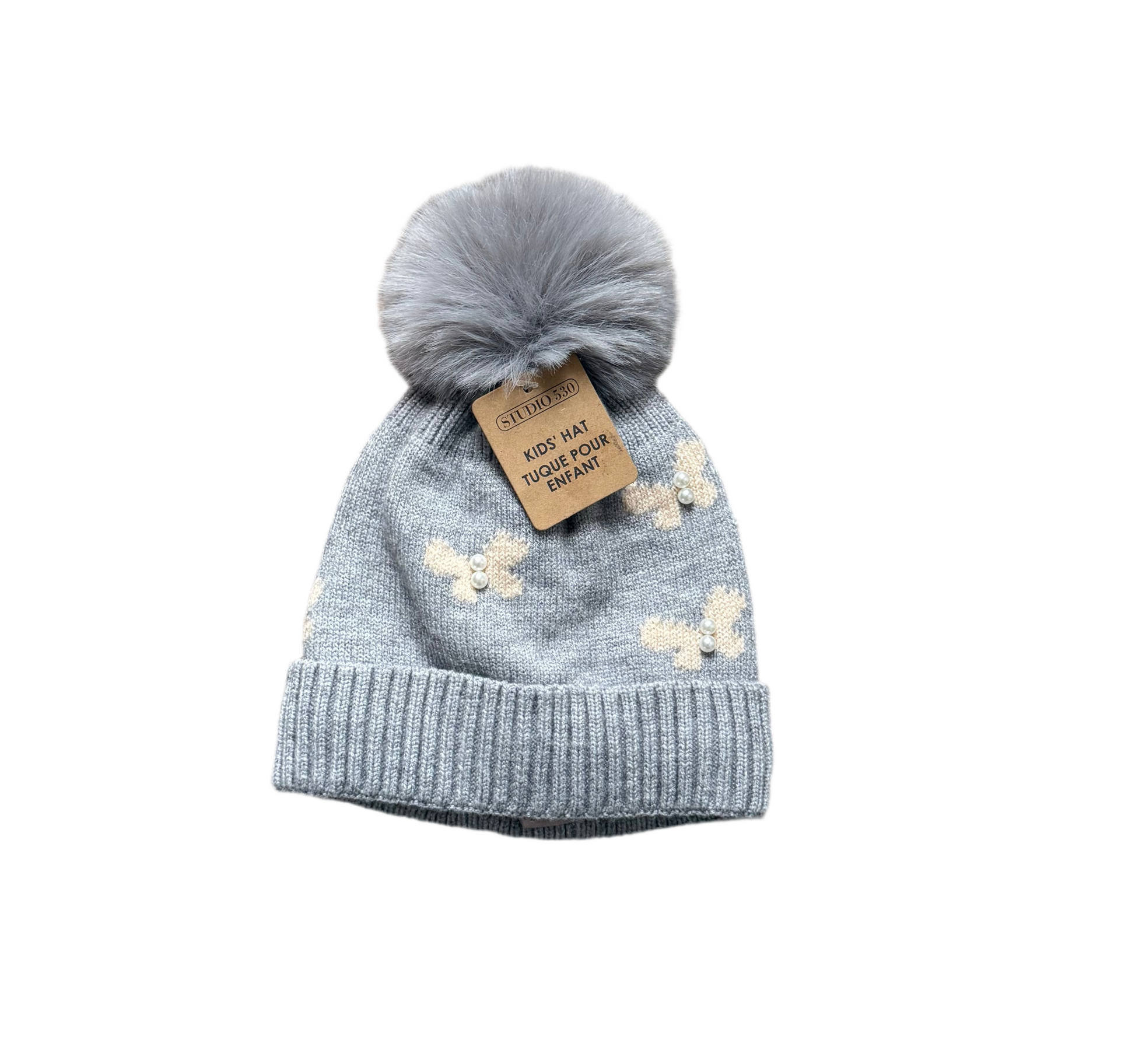 Tuque avec un pompon « fausse fourrure ». Imprimé « papillon ». Détails petites perles. Doublée.