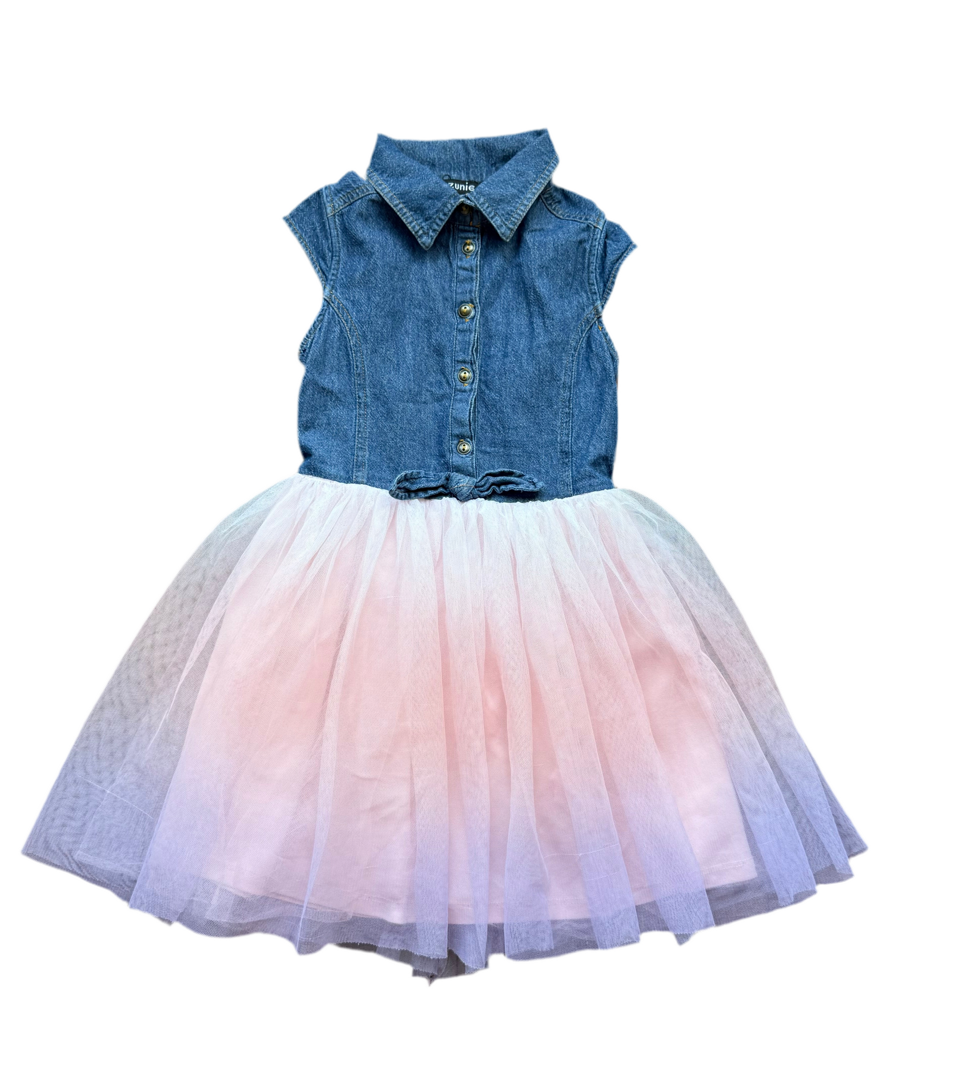Robe bi-matière jeans et tulle dégradée. Boutons.